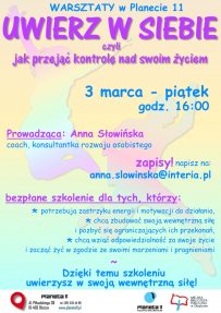 Warsztaty „UWIERZ W SIEBIE, czyli jak przejąć kontrolę nad swoim życiem” – zapisy