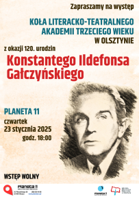 Gałczyński | występ Koła Literacko-Teatralnego ATW w Olsztynie przez Administrator · Opublikowano 16 stycznia 2025 · Zaktualizowano 24 stycznia 2025 . Zapraszamy do Planety 11 na występ Koła Literacko-Teatralnego Akademii Trzeciego Wieku w Olsztynie z okazji 120. urodzin Konstantego Ildefonsa Gałczyńskiego czwartek | 23 stycznia 2025 godz. 18:00 WSTĘP WOLNY FOTORELACJA: [Pokaz zdjęć]