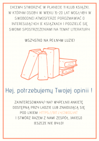 Chcemy stworzyć w Planecie 11 Klub Książki, w którym osoby w wieku 15-20 lat mogłyby w swobodnej atmosferze porozmawiać o interesujących je książkach i podzielić się swoimi spostrzeżeniami na temat literatury.